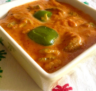 Dabbu Mirchi Raiten is a Goan dish. It is a mild or medium spicy, sweet and a slightly tangy coconut based dish. It is served as an accompaniment to the main course. This dish is suitable when the meal is without onion and garlic.
